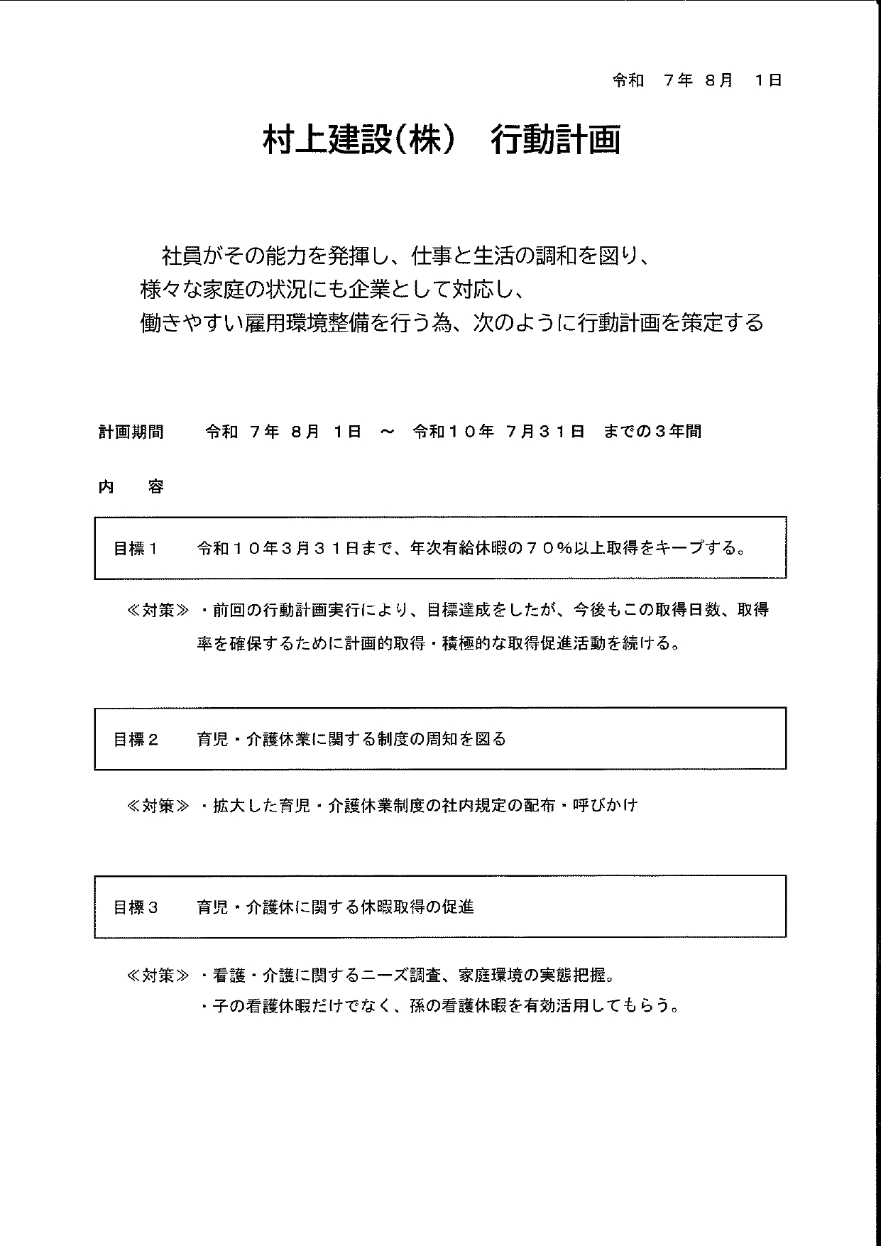 令和10年までの3年間で雇用環境の整備を行う事で、仕事と生活の調和を図り、社員一同が更なる能力を発揮出来るよう努めます。